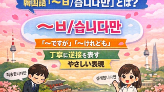 TOPIK 1・2級 韓国語『〜ㅂ/습니다만』とは?|丁寧に逆接を表す表現を完全解説 韓国語で「〜ですが」「〜けれども」と丁寧に伝えたいとき、どの表現を使えばいいのですか?そんなときに役立つのが 「〜ㅂ/습니다만」 です。この表現は、相手に配慮しながらやわらかく逆接を伝えたり、依頼や質問の前にクッションとして使える、とても便... 2026.04.08 TOPIK 1・2級韓国語文法