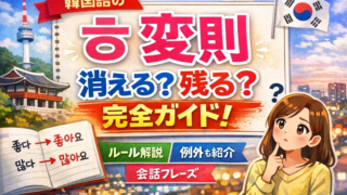 韓国語文法 韓国語の「ㅎ変則」とは?|消える?残る?完全ルール解説+例文 韓国語のㅎ変則をわかりやすく解説。좋다・많다・그렇다などの活用ルール、例外、覚え方、会話で使える例文まで初心者向けに完全解説します。 2026.04.01 韓国語文法